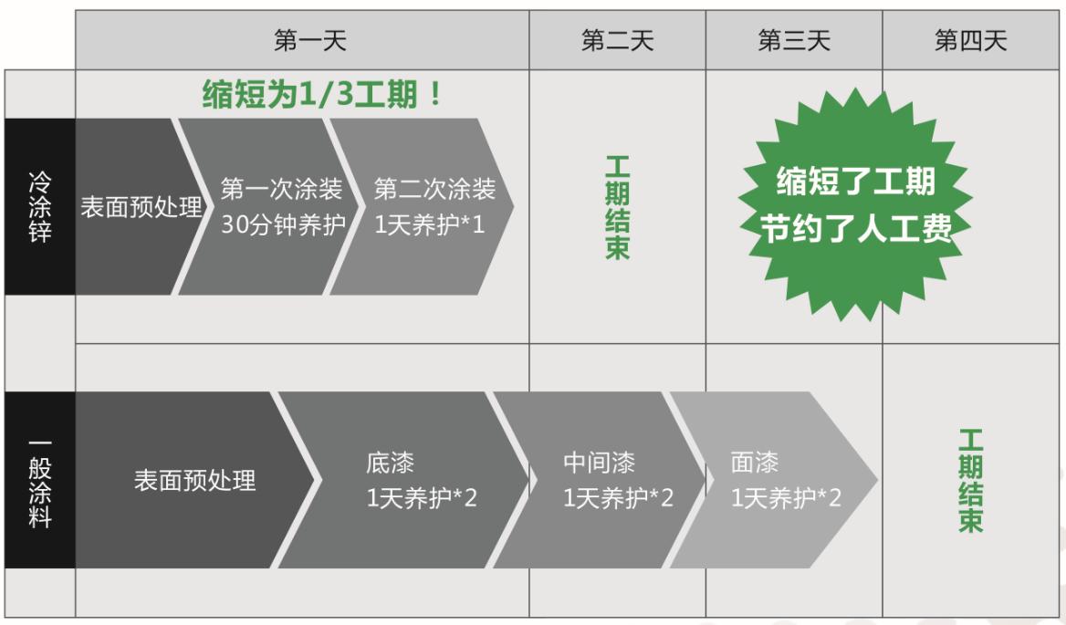 ? 冷涂鋅技術(shù)解決了傳統(tǒng)油漆涂料防腐年限短、壽命周期多次維護(hù)費(fèi)用(LCC)高、漏涂和破損處銹蝕速度快、焊縫處易留黃水等問題。